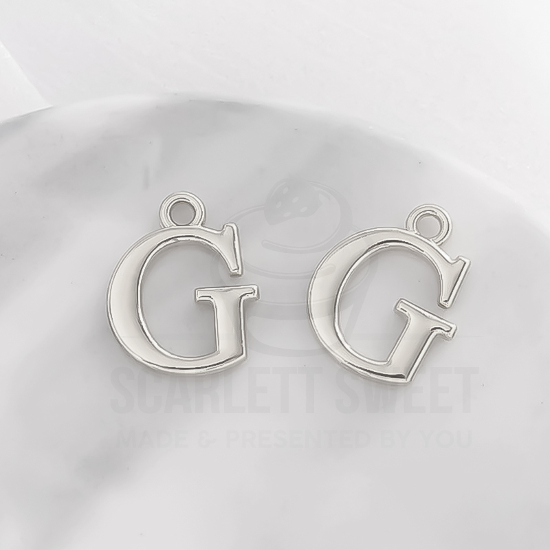 6pc Silver letter charms measure appox 1.6cm x 1cm.