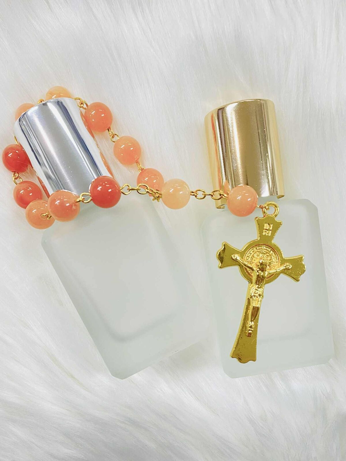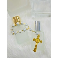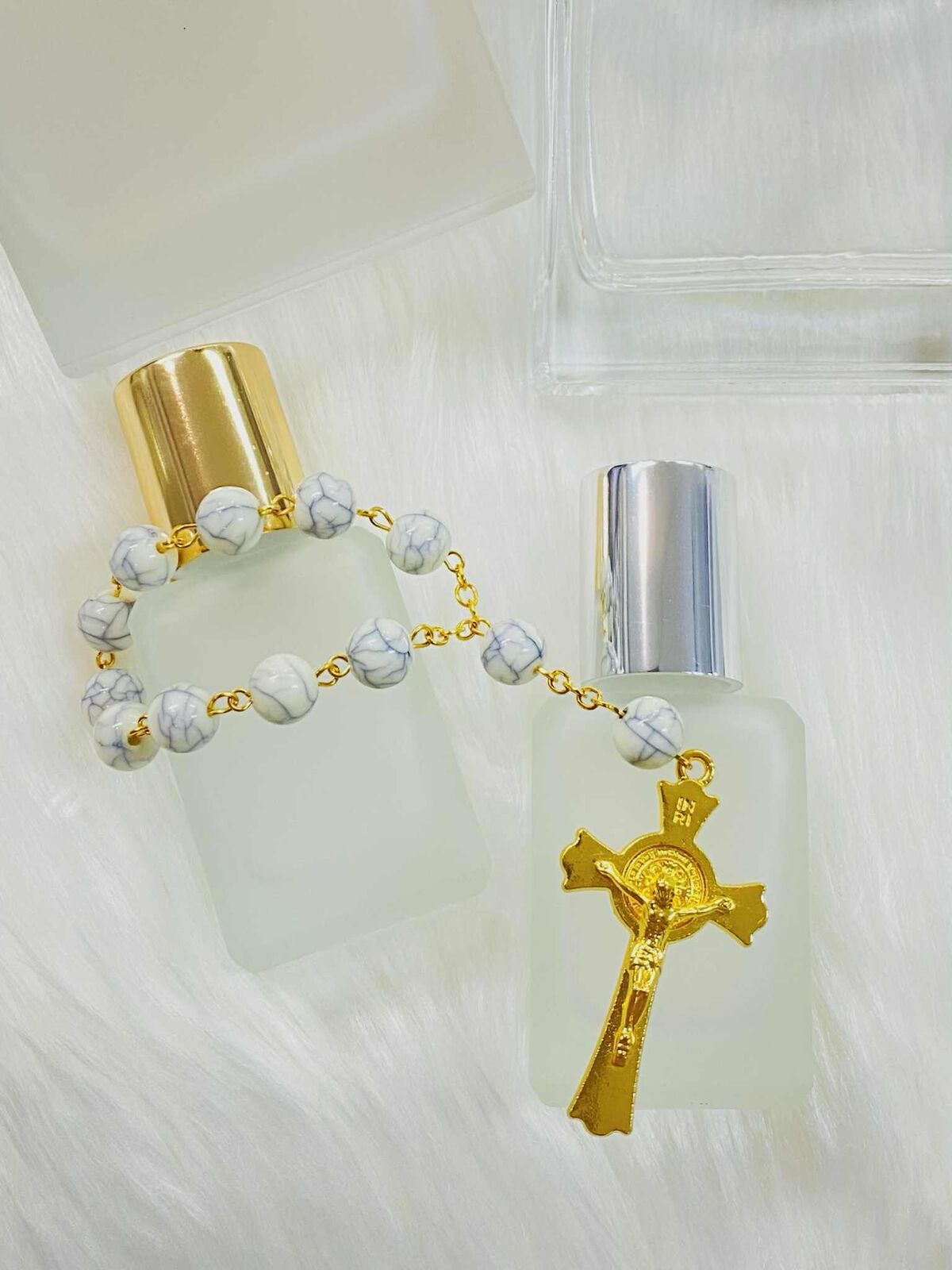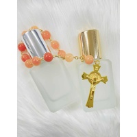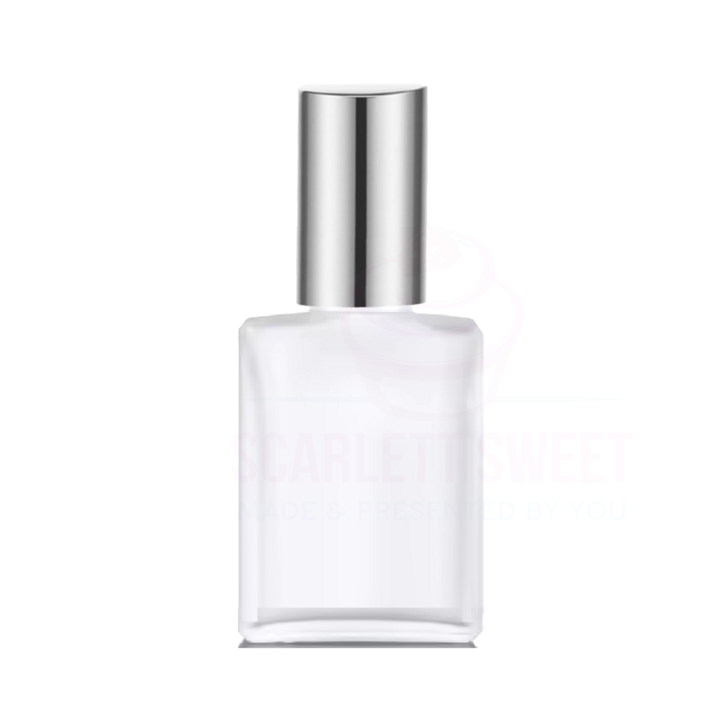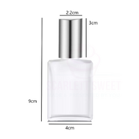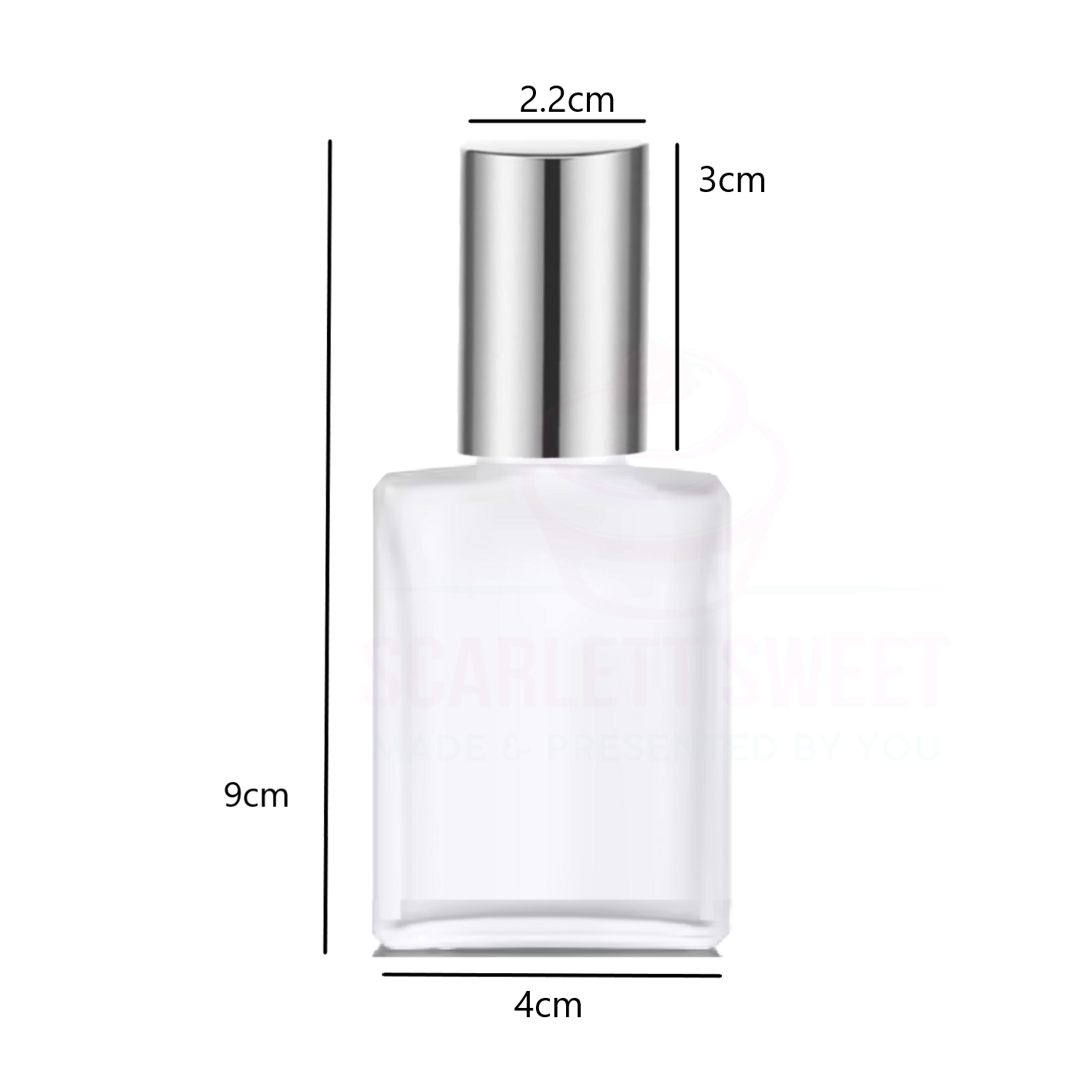 Glass bottle with aluminium screw lid measures approx 9cm tall by 3.8cm wide, 3cm deep. 30ml volume.