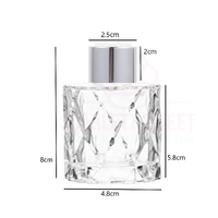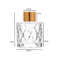Glass bottle measures 7.4cm tall by 5cm wide, 50ml volume.