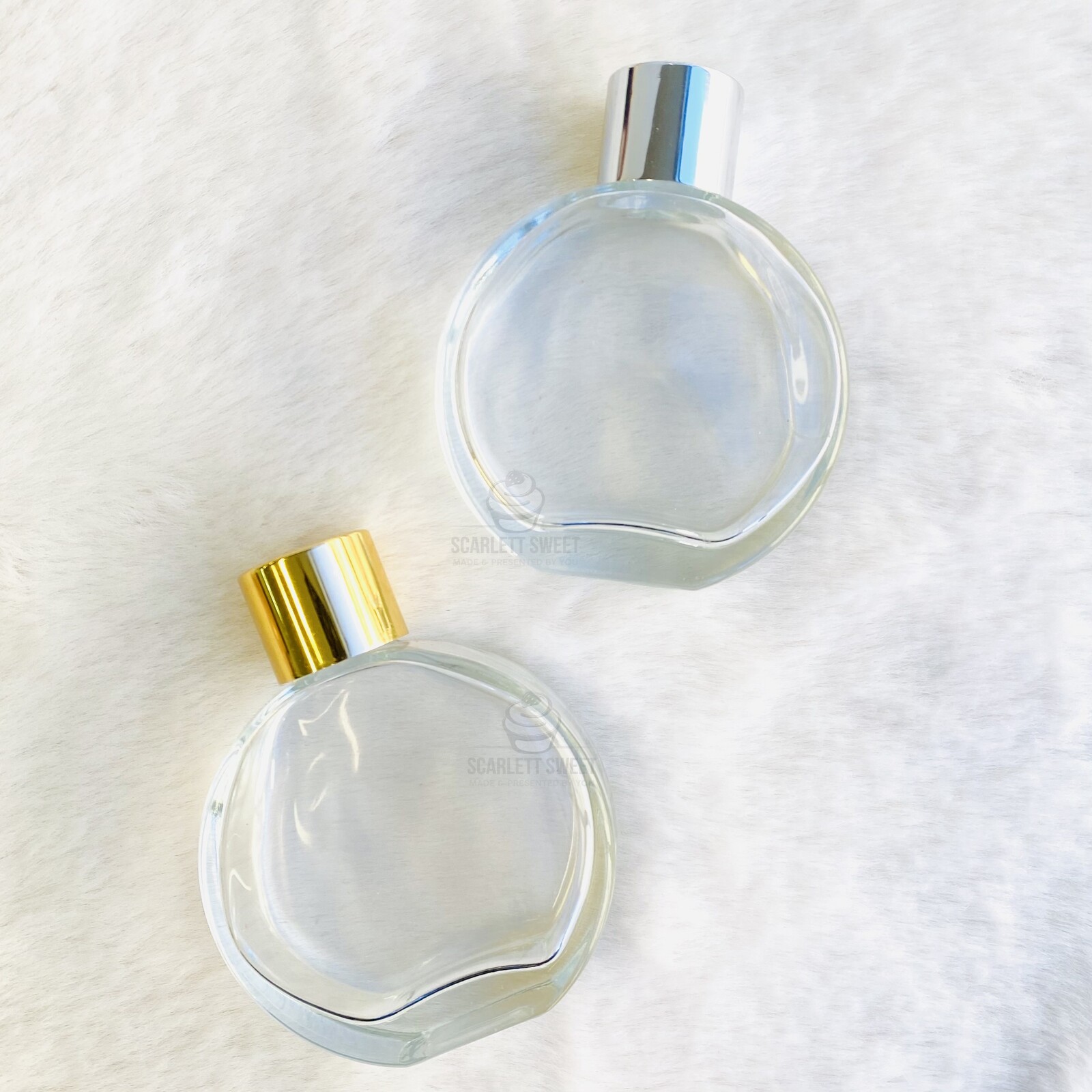 Our flat round glass bottles comes in 2 sizes: 50ml & 100ml.